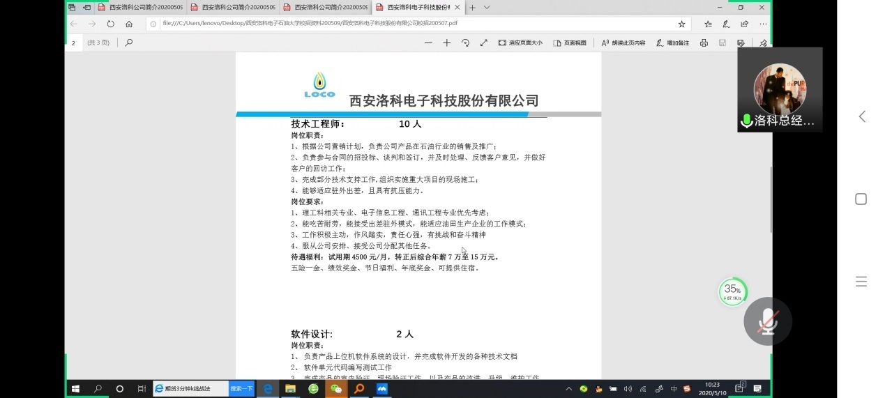 西安洛科電子科技股份有限公司總經理蘭孟平結合PPT,向參會畢業生宣講介紹了洛科公司的發展史、經營理念、企業文化、業務范圍、招聘需求等情況,重點介紹了不同崗位的工作性質、福利待遇、工作地點等情況。此次洛科公司舉辦線上專場招聘會共需招聘技術工程師、開發助等崗位人員20人。隨后,參會畢業生就自己關注的具體問題與蘭孟平總經理進行了線上交流咨詢,蘭孟平總經理表示誠摯邀請廣大畢業生到公司實習、考察,期待同學們加入快速發展的洛科電子大家庭。