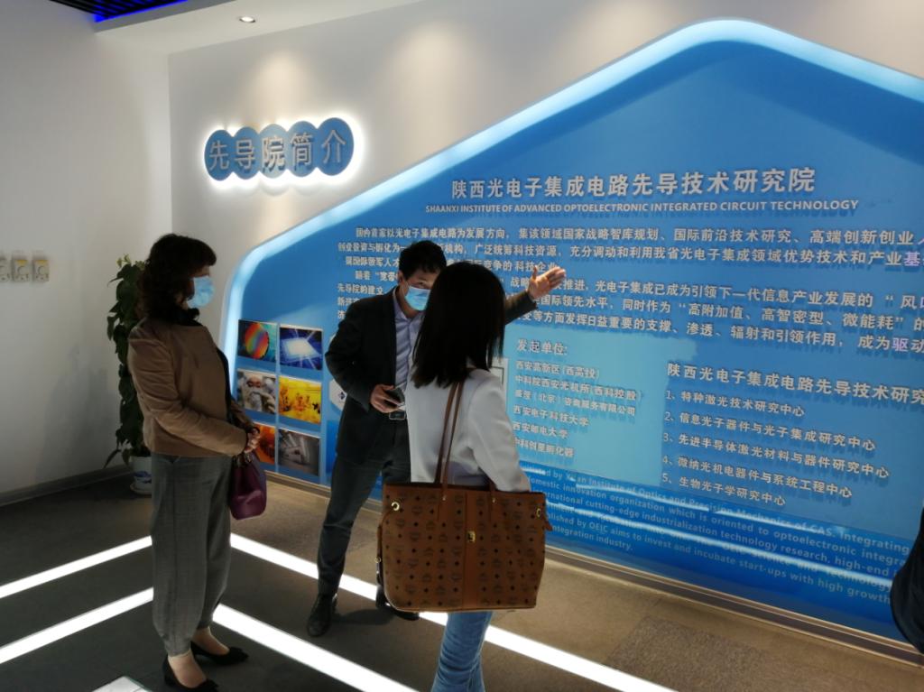 在光電子集成專業化眾創空間,調研組重點了解了陜西光電集成電路先導技術研究院的發展情況,特別是政府引導、金融資本、民間投資共建的光電子基金在創新科技金融體系、加速成果轉化應用中的重要作用,及其對陜西省眾創空間借助金融工具實現高質量發展的成功經驗。