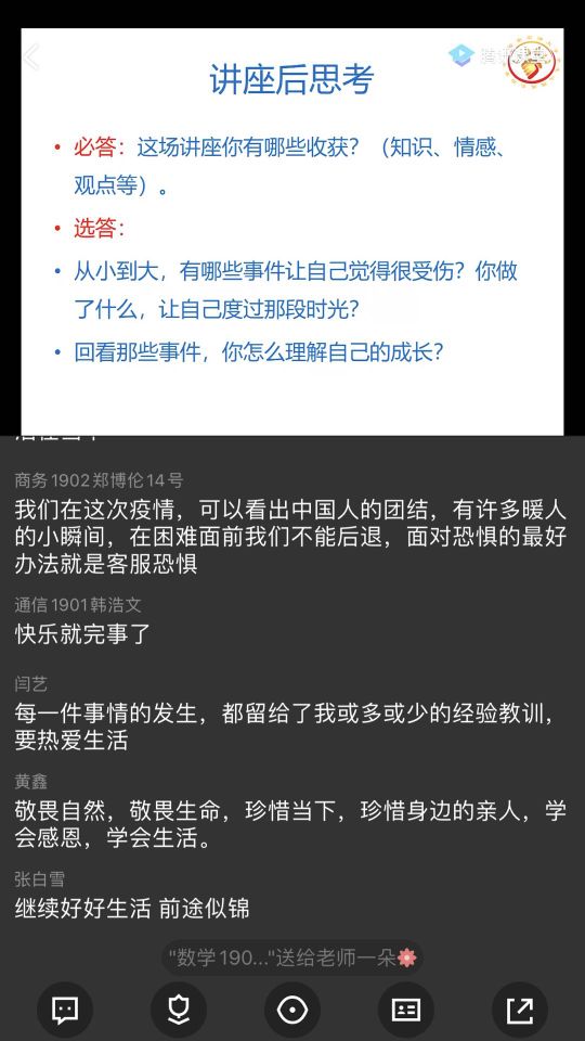 肖老師講到,新冠肺炎嚴重暴發期間,人們的注意力在疾病本身,而“后新冠”肺炎時期的當下,人們更關注新冠肺炎造成的影響,尤其是心理影響。她以“新冠肺炎”疫情中的喪失為切入點,讓同學們回顧疫情期間的情感、行為及關系,體會在疫情期間喪失了什么,又引導同學們辯證地思考喪失中是否只有失去,在學生們總結出抗“疫”期間的收獲后,啟發同學們覺察新冠肺炎疫情帶給自己的成長。