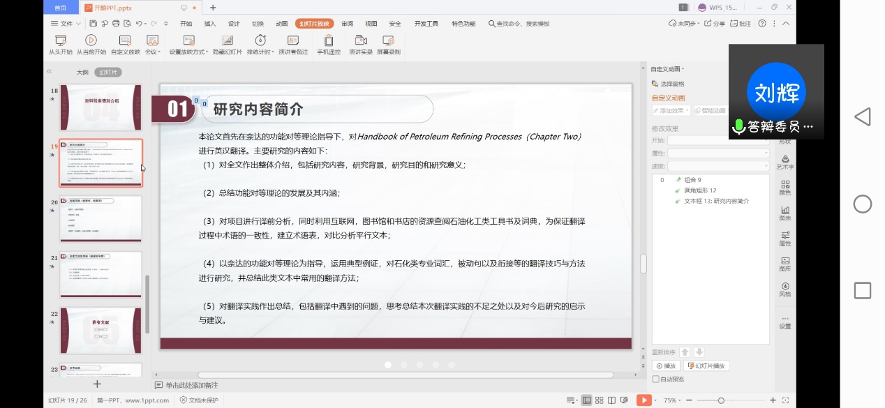 研究生學位論文開題是完成學位論文工作的基礎,是保證學位論文質量的重要環節,為保證研究生培養質量和研究生學位論文水平,外國語學院依據研究生院《碩士學位論文開題管理補充規定》制定了2018級翻譯碩士研究生二次開題工作細則,并于4月3日上午,使用線上平臺(騰訊會議)進行了2018級翻譯碩士研究生二次開題答辯會。答辯小組包括組長袁森教授,答辯委員劉輝教授和秦艷霞副教授,共有9名翻譯碩士研究生參加答辯。
