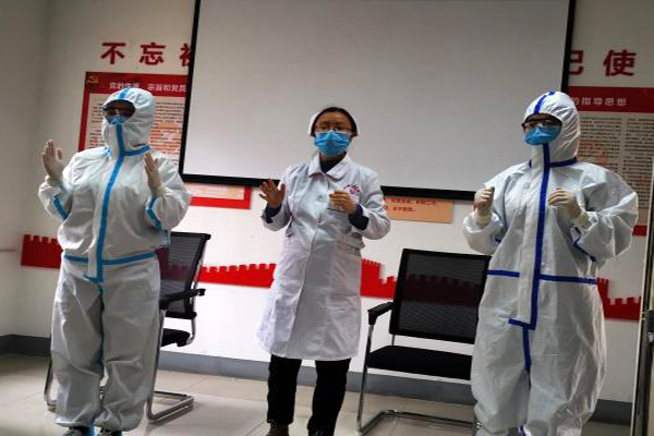 此次培訓由校醫院業務副院長李明珠主持,共分三個環節進行:一、組織醫務人員觀看穿脫防護服的教學視頻。二、分別由茹萍、王瑞兩位護士長現場講解,兩位工作人員示范手衛生和穿脫防護服的方法。三、全院醫務人員進行實操練習,兩位護士長手把手的指導,對存在的問題予以當場指出并及時改正,保證所有醫務人員一次性通過考核。