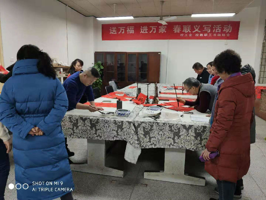 2020年元月9日,農歷庚子新年來臨之際,為深入學習宣傳貫徹習近平新時代中國特色社會主義思想和黨的十九大、十九屆二中、三中、四中全會精神,弘揚中華優秀傳統文化,豐富廣大職工精神文化生活,營造歡樂祥和的節日氛圍,校工會、校教職工書畫協會按照省總工會工作部署,在雁塔校區圖書館四樓書畫活動室開展“送萬福、進萬家”書法公益活動。為廣大教職工義務書寫春聯,把校工會對全校教職工的關懷和祝福送到每家每戶。