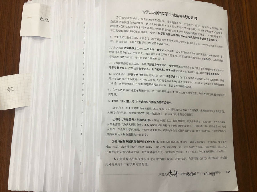 系列活動之簽署誠信考試承諾書。為進一步加強學生誠信意識,將誠信考試落到實處,確保將考試相關紀律要求傳達給每一名同學,堅決抵制作弊行為,各班級印制承諾書,組織各班級同學簽署誠信考試承諾書,要求同學們謹記承諾內容,克服僥幸心理,自覺抵制作弊行為,力求達到教育廣大學生誠信考試的目的,激發學生學習動力。