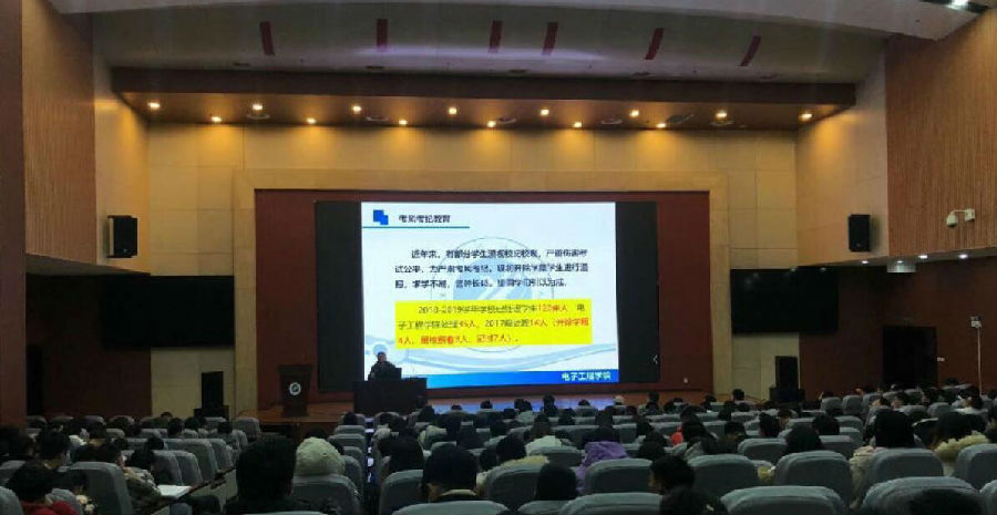 系列活動之召開學風考風推進會議。電子工程學院2017級輔導員高建邦分專業對學院2017級學生召開學風考風推進會議。高建邦老師首先對學生進行誠信教育,提高大學生的誠信應考意識,引導青年學生牢固樹立守信光榮、失信可恥的道德觀念。隨后,高老師對考試紀律規定,違紀處分管理規定等方面做了詳細介紹,并通報了近年來因作弊處分的學生情況,讓同學們深刻認識到違反制度對自身發展的影響。