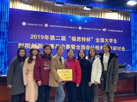 2019年12月14日,由中國商業會計協會主辦,中南財經政法大學會計學院大學承辦的2019年第二屆“福思特杯”全國大學生財稅創新大賽總決賽在中南財經政法大學落下帷幕。由經濟管理學院聶亦慧老師指導,劉方迪、吳迪、楊晨卓、黃娣、林穗佳五位同學組成的參賽團隊,順利躋身最終決賽并獲三等獎。