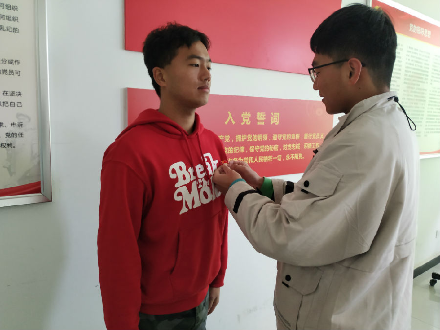 活動上,2019年轉正的學生黨員們向2019年入黨的黨員們贈送了《中國共產黨章程》,并為他們佩戴了黨徽,希望他們可以牢記黨員身份,提醒他們在學習和生活中時刻以黨員的標準嚴格要求自己,切實發揮先鋒模范作用,為學院、班級和同學們做好服務。