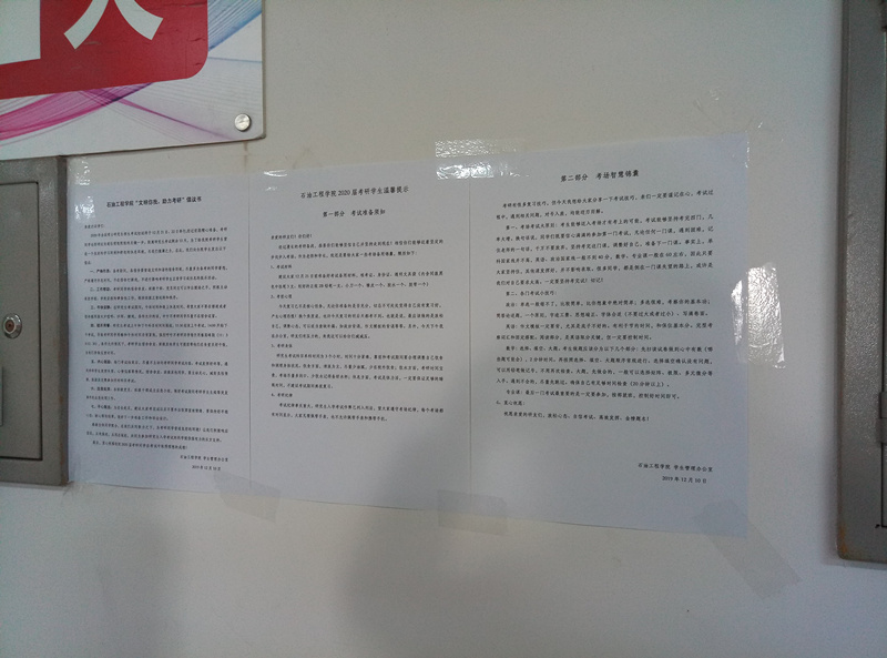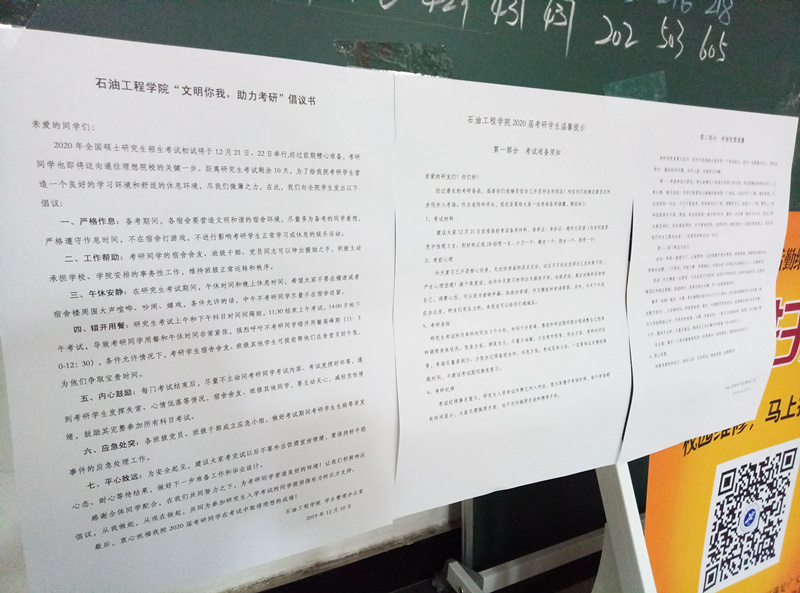 為了給我院考研學生營造一個良好的學習氛圍和舒適的休息環境,便于他們順利進行最后沖刺和完成為期兩天的全國碩士研究生入學考試。12月10日,在學院領導的指示和引導下,石油工程學院2016級在畢業班學生所住10號宿舍樓公告欄、各樓層樓梯口、考研自習室等處張貼了主題為“文明你我,助力考研”倡議書。