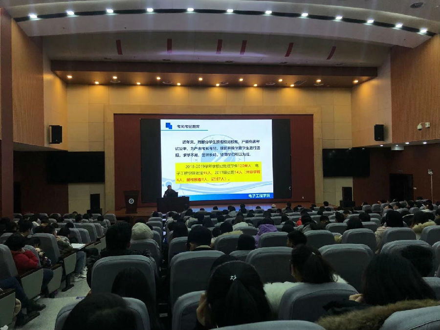 12月9日晚七點,電子工程學院2017級年級大會暨考風考紀教育大會在鄠邑校區弘石學術報告廳召開,會議由電子工程學院2017級輔導員高建邦老師主持,學院全體2017級學生參加了本次大會。大會內容從學生現階段的學習和生活實際出發, 主要從“身心健康教育”、“考風考紀教育”、“安全教育”“獎助學金工作匯報”“專業學習及畢業選擇”等內容展開。