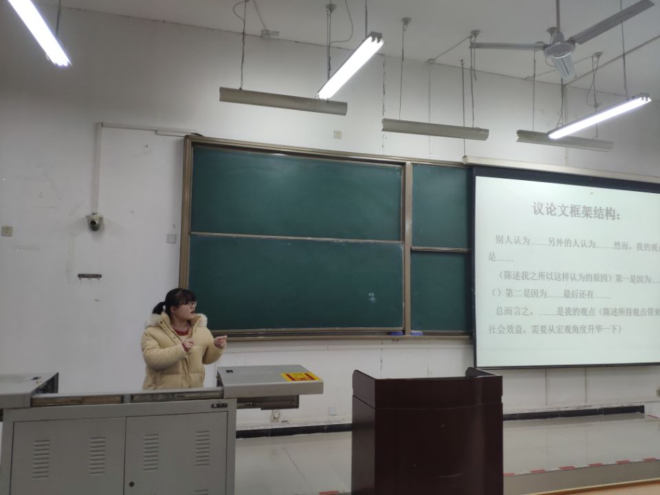其次,薛洋同學根據個人英語學習和考試經驗,從議論文、書信、圖表和看圖說話四個板塊對同學們著重講解了英語四級作文的寫法,并基于近幾年考試真題,結合自己撰寫的英語作文對同學們進一步闡述。