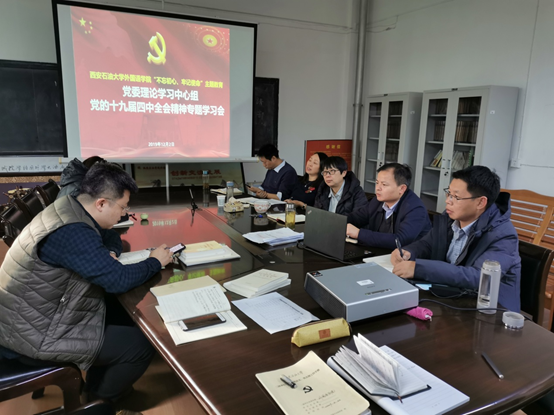 蔡強書記帶領中心組成員通過觀看視頻的方式全文學習了《中國共產黨第十九屆中央委員會第四次全體會議公報》,帶領全體成員學習了習近平總書記在十九屆四中全會上作的關于《中共中央關于堅持和完善中國特色社會主義制度推進國家治理體系和治理能力現代化若干重大問題的決定》的說明,學習了《中共中央關于堅持和完善中國特色社會主義制度推進國家治理體系和治理能力現代化若干重大問題的決定》的主要內容,還與大家一起學習了習近平總書記在中央政治局第十七次集體學習時的重要講話。集體學習結束后,學院黨委理論學習中心組成員分別結合個人工作實際,對本次學習內容進行了充分交流研討,分享了個人感想與學習收獲。蔡書記強調,學院黨委理論學習中心組成員要把學習貫徹十九屆四中全會精神與主題教育、學院教學科研管理各項工作有機結合起來,學習好、宣傳好、貫徹好全會精神,用全會精神指導實踐工作,聚焦主題教育整改落實中的制度廢改立工作,完善學院各項管理制度,不斷提高學院內部管理制度化、規范化、科學化水平。