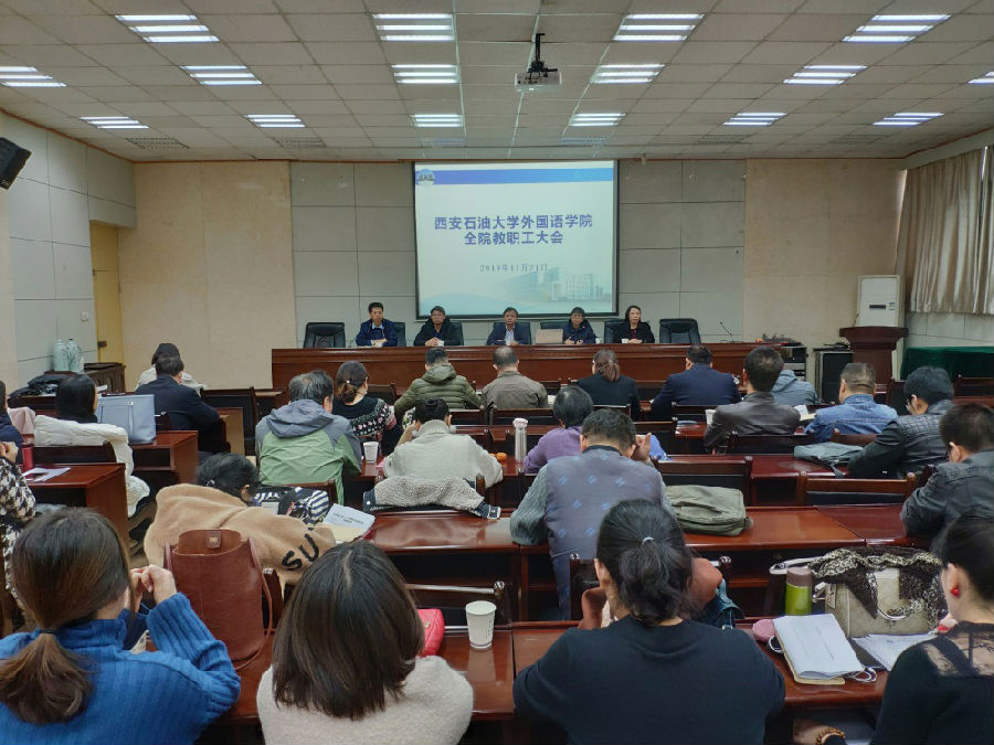 11月21日下午,外國語學院在雁塔校區第三會議室召開全院教職工大會暨師德師風專題學習會,學院全體教職工參加會議,會議由學院黨委書記蔡強主持。