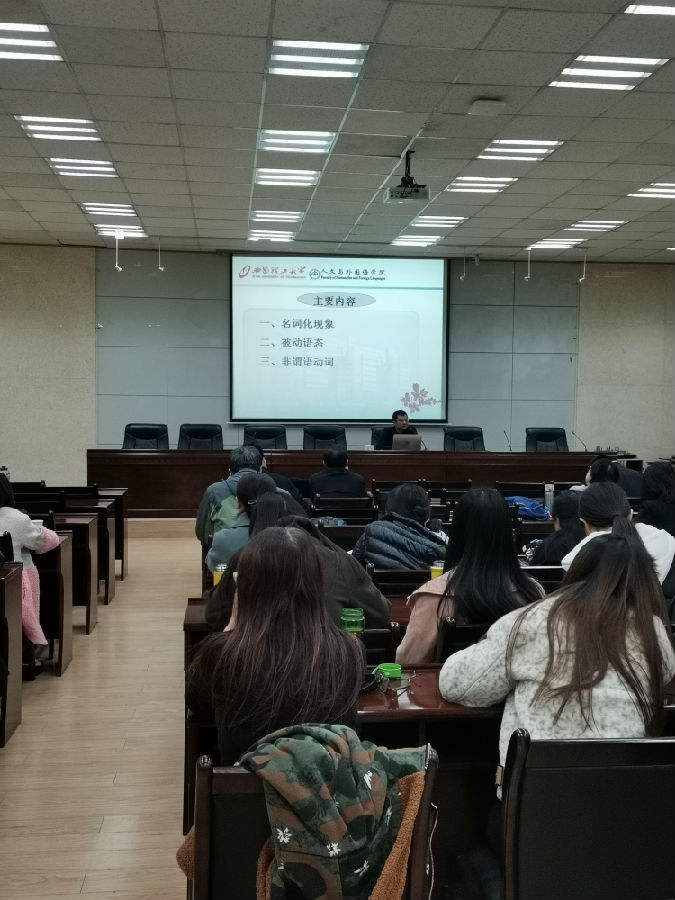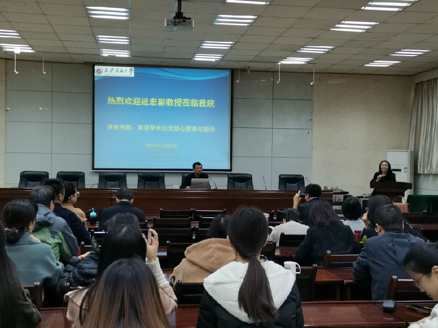 2019年11月20日下午15:00,在我校雁塔校區會議中心第三會議室,全國知名科技英語專家,西安理工大學科技英語翻譯研究所副所長延宏教授應邀做了題為《英語學術論文語言核心要素與翻譯》的學術報告。外國語學院教師和研究生參加了此次報告,報告由外國語學院副院長劉輝主持。