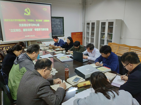 11月21日下午,外國語學院黨委理論學習中心組在雁塔校區1號教學主樓701會議室召開“立足崗位、履職盡責”專題學習研討會。學院黨政領導班子、理論中心組成員、教工黨支部書記參加了會議,會議由學院黨委書記蔡強主持。