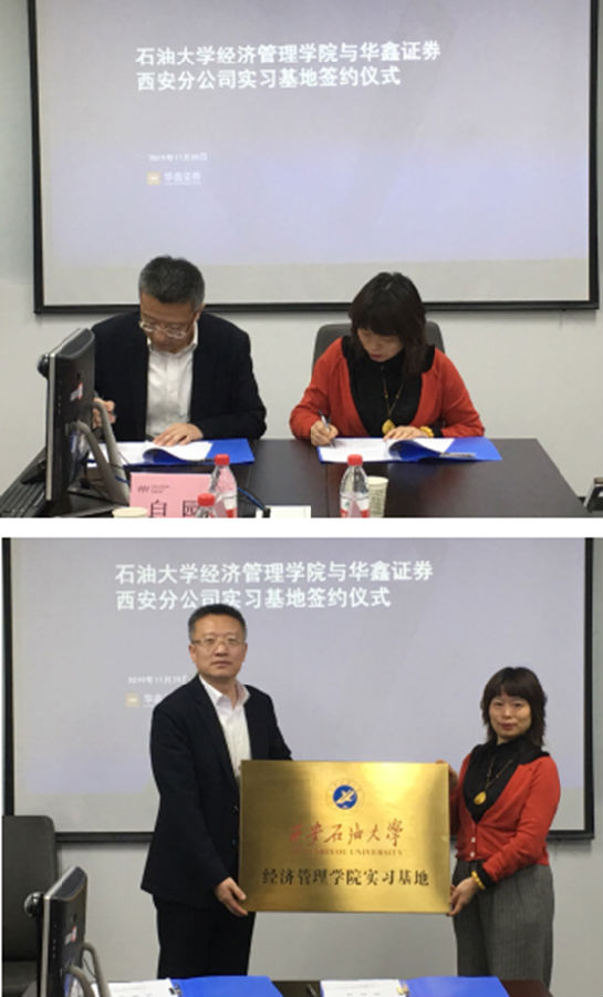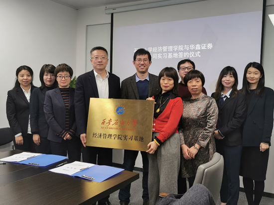 11月20日,經濟管理學院與華鑫證券西安分公司實習基地協議簽約和授牌儀式在華鑫證券西安分公司舉行。華鑫證券西安分公司聯席總經理邱毅華、區域財富管理中心總經理李靖、綜合管理部總經理白園,華鑫證券南二環營業部總經理廖聲隆、財富總監伍丹、機構業務部總經理蔣雯麗,經濟管理學院院長王君萍教授、金融學專業帶頭人石冬蓮教授以及李春霄博士、李善燊博士出席簽約授牌儀式。王君萍院長和邱毅華總經理代表雙方簽署了實習基地協議并授牌。