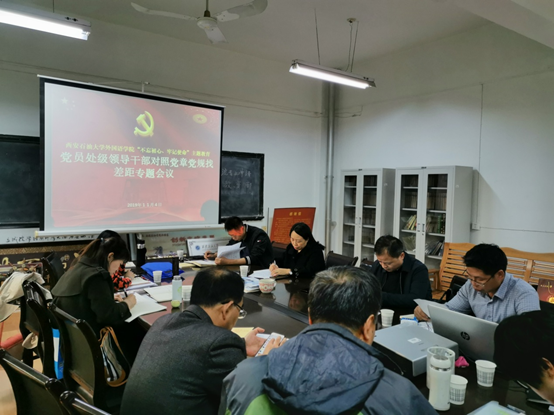 在黨員處級干部對照黨章黨規找差距專題環節,學院黨委書記蔡強、黨委副書記王業青、副院長劉輝、副院長陳武先后結合個人崗位工作及履職擔當情況,按照學校“不忘初心、牢記使命”主題教育領導小組《關于在“不忘初心、牢記使命”主題教育中做好對照黨章黨規找差距的通知》的要求,嚴格對照黨章、《準則》、《條例》和《中國共產黨工作機關條例(試行)》,逐條進行了自我檢視找差距,明確自身不足與整改方向,并就個人對照檢查的整改臺賬、整改措施與參會同志進行了討論交流。