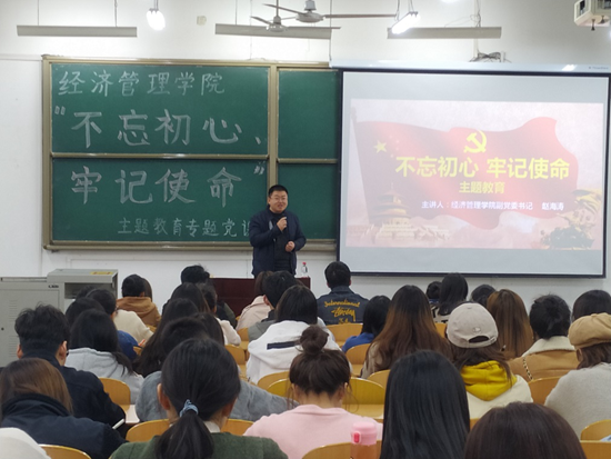 根據學校相關文件精神和學院“不忘初心、牢記使命”主題教育工作安排,10月25日下午,經濟管理學院在鄠邑校區B區教學樓112室召開全體學生黨員大會。學院黨委副書記趙海濤出席會議并講授黨課,學院本科生以及研究生黨員近200人參加。