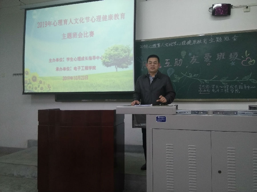 為進一步加強大學生心理健康教育工作,落實我校2019 年心理育人文化節系列活動,10月23日中午,由學生心理成長指導中心主辦、電子工程學院承辦的“朋輩互助,有愛班級”心理育人主題班會比賽在A區217教室舉行。學生工作部(處)副部(處)長龐秉謙、部分院(系)主管學生工作負責人、心理輔導員、學生心理成長指導中心指導老師、參賽班級心理委員及學生代表共70余人觀看比賽。