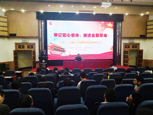 為扎實開展好“不忘初心、牢記使命”主題教育工作,有效推進主題教育工作有序開展,2019年10月17日下午,機械工程學院和外國語學院聯合在雁塔校區學術報告廳舉辦“牢記初心使命、推進自我革命”專題學習報告會,特邀知名黨建專家、中共陜西省委黨校科社部原主任,中國延安干部學院王誠安教授主講,兩個學院的教師、研究生200余人參加了學習報告會,機械工程學院黨委田黨宏書記主持報告會。