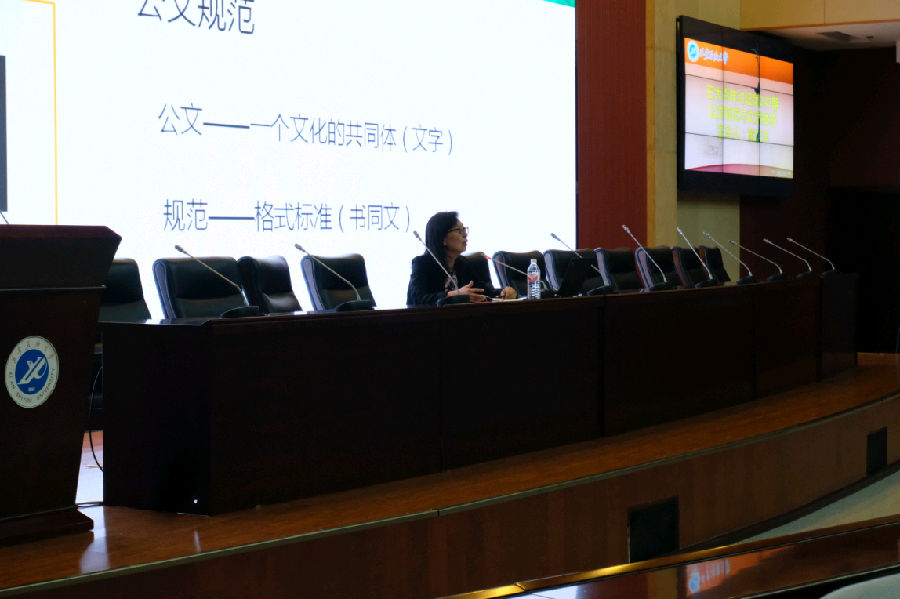 黃慶豐老師現為西安石油大學人文學院副院長,陜西省寫作學會副秘書長,國際漢語應用寫作學會理事。在講座中,黃老師首先闡述了公文的概念,從中國歷史上公文的發展與演變角度講起,以眾多歷史博物館中文物上的文字文獻為例,展示了文字文明與公文的重要性。隨后,通過歷史文獻資料,名人事跡等講述了“文章”“文體”等概念要求。最后表示時代在發展,只有不斷學習進步,才不會落下腳步。黃老師以日本,韓國學習中國文化、中國學習其他國家為例,提出自己的觀點:只有比其他人更努力,懂得更多,才更有可能獲得成功。在互動環節,同學們踴躍發言,黃老師就“機器人替代危機”、“文科就業優劣”等問題認真進行了解答。