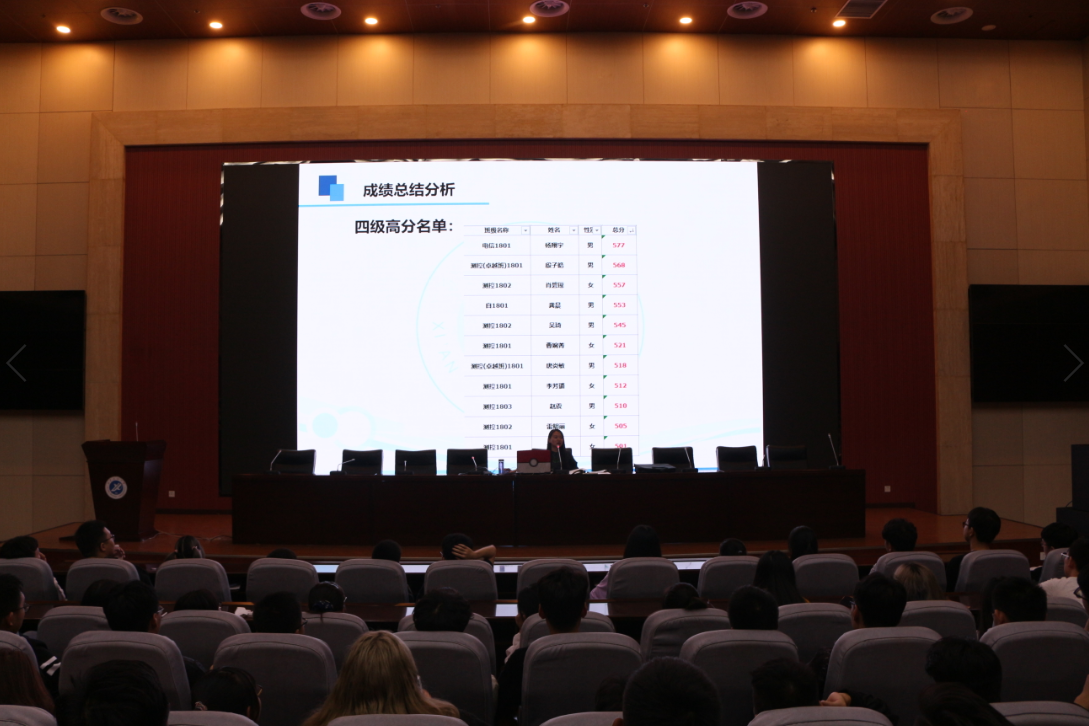 錢宇航老師對本年級學生上一學期的期末成績做出了分析,通報了本年級英語四、六級考試通過率,表揚了通過英語六級考試以及英語四級考試成績超過五百分的學生,她勉勵在座的各位學生以優秀為榜樣,規劃人生,樹立理想,腳踏實地,勤奮學習,希望以此在同學中形成“比、超、趕、追”的良好學習氛圍。