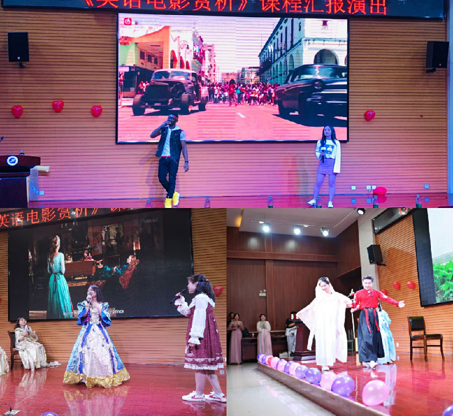 本次匯演活動共有節目12個,分成兩部分。第一部分由主講教師張磊介紹外國語學院本學期大學英語教學改革分方向《英語電影賞析》的課程情況;緊接著由三名同學進行課程匯報,分享學習感悟。接下來是匯演的第二部分,節目異彩紛呈,包括英語話劇、經典英語電影配音、歌曲演唱、英文詩歌朗誦及英語舞臺劇等等,匯演現場高潮不斷迭起,整個會場掌聲不斷。