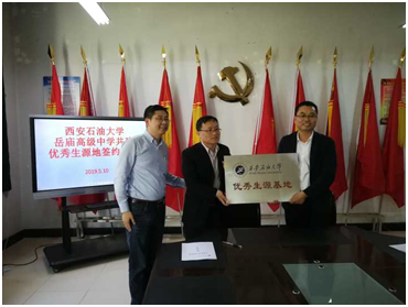 隨著2019年招生工作開始,為了進一步加強招生宣傳,提高我校生源質量。5月10日,電子工程學院、組織部和規劃處分兩隊走訪了渭南市四所中學:富平縣藍光中學、迤山中學、曹村中學以及華陰縣岳廟高級中學,簽訂了“西安石油大學優秀生源基地”合作框架協議,進行基地掛牌。參與本次活動的有電子工程學院何鋮書記、組織部王亮副部長、規劃處陳濤副處長、電子工程學院燕并男副院長和高國旺副院長以及部分教師代表。在走訪過程中,與中學校領導、部分老師進行座談,宣傳我校的發展歷程、重點實驗室、專業特色、就業方向、優秀校友等方面,發放我校招生宣傳冊。中學相關人員表示,通過座談,對我校的特色與優勢有了進一步的了解,愿意在學生中積極宣傳,鼓勵學生報考我校。