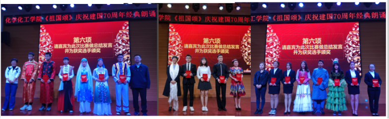 經過激烈角逐,由學生工作處,化學化工學院黨委、團委、學生黨團員代表及學生會代表的8人評審團,按照選題立意、朗誦內容、作品感染力、個人儀態、現場效果等方面,對參賽作品逐一進行打分。最終環境1701班塔衣爾·米吉提、化工1802班如孜古麗·麥麥提等8名選手帶來《感恩祖國 祝愿祖國》與化卓1801班馬再升同學帶來的《與祖國同行 筑華夏輝煌》榮獲一等獎;應化1601班旦增格列、環境1603班阿依巴拉·色里克別克等8人共同演繹的《盛開的團結之花》與環境1802班杜娜、化工1802班王新玥分別朗誦的《換了人間》《走向屬于您的明天》獲得二等獎;應化1803班楊蓉、能化1802班高雨如帶來的《我的祖國》,化工1701班阿依尼格爾·艾山、化卓1801班李闊等6人朗誦的《民族大團結》,化工1704班馬志新、化工1801班李成蘭等8名同學帶來了《為偉大的盛典歌唱》榮獲三等獎。與會領導老師為獲獎選手代表逐一頒獎。