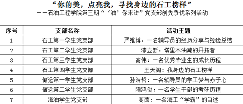 為全面學習貫徹黨的十九大精神,深入貫徹落實習近平新時代中國特色社會主義思想,按照新時代黨的建設的總要求,推動全面從嚴治黨向基層延伸,進一步增強支部書記抓好黨建工作的責任意識,激發基層黨支部活力,切實提高學院黨建工作質量,石油工程學院組織開展了“‘油’你來講”——學生黨支部創先爭優活動,目前進行到第三期。