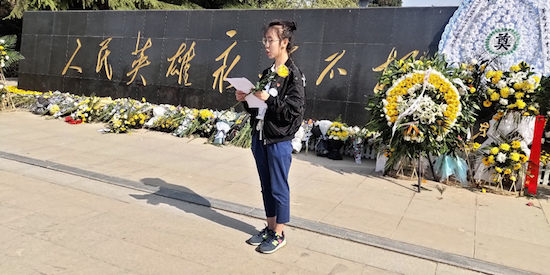 會計1603班歐陽榕襄作為代表致悼詞。她說到,矗立在大家面前的烈士豐碑,訴說著英雄們光榮而無悔的事業,歲月的風塵早已在它身上刻下斑駁的印記,讓大家無法不回想起那段滄桑沉重的往事。七百余位革命烈士長眠于此。他們為追求救國救民的真理拋頭顱,灑熱血;為中華民族的解放事業前仆后繼,視死如歸。作為新時代的莘莘學子,更應充滿愛國之情,樹立報國之心,努力學習,繼承先烈遺志,為家鄉的建設、為祖國的富強而努力奮斗。