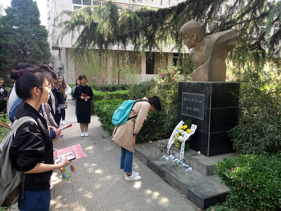 離開烈士陵園后,大家步行至我校雁塔校區,在烈士唐春雨的雕像前,行鞠躬禮,以表達崇敬和懷念之情。