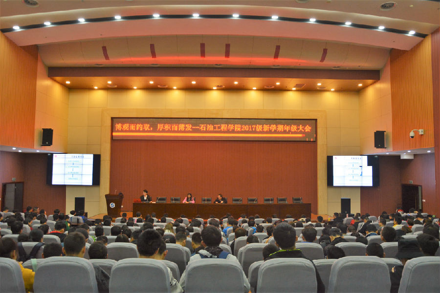 為進一步總結學習情況,樹立正確目標,3月13日下午4點,石油工程學院2017級“博觀而約取,厚積而薄發”主題年級大會于我校鄠邑校區弘石學術報告廳召開,石油工程學院黨委副書記張建高、2017級輔導員張楠、孫浩哲和全體2017級學生共370余人參加,會議由孫浩哲老師主持。