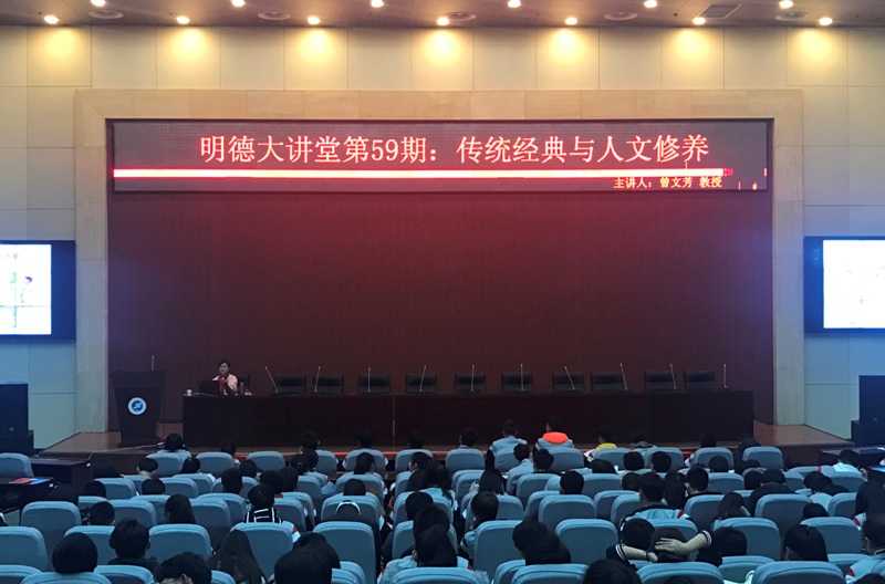 12月25日晚,由校團委主辦的第五十九期明德大講堂《傳統經典與人文修養》在鄠邑校區圖書館弘石學術報告廳成功舉辦。中共陜西省委黨校曾文芳教授應邀擔任主講,鄠邑校區400余名師生聽取了此次講座。
