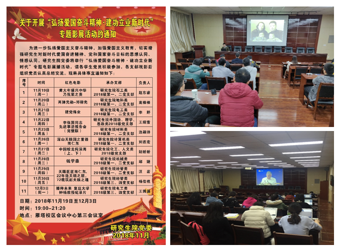 此次專題影展活動從11月19日播放至12月3日,歷時長達兩周,其中涉及2018級研究生21個黨支部的200余名黨員、入黨積極分子、部分共青團員等。在研究生院黨委的指導下,研究生各黨支部分批次先后在雁塔區會議中心第三會議室進行了十余場觀影活動。