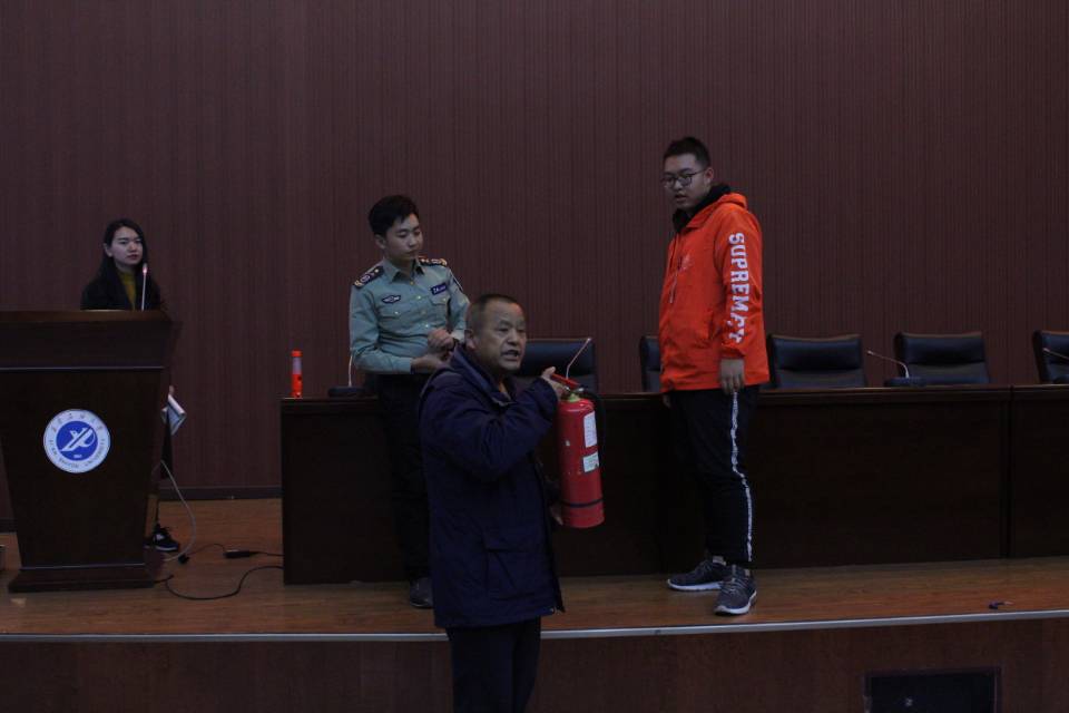 講座一開始,高教官從不久前上海高校發生的火災講起,由淺入深地進行了消防安全知識的講解,內容涉及了火災發生的原因、怎樣預防火災、火災逃生的基本知識、滅火器的正確使用方法等。高教官不僅從理論上向大家講授了關于消防的各種安全防范知識,還列舉了大量的實際生活中的案例,教訓深刻,發人深省。高教官現場指導了同學們如何操作干粉滅火器。