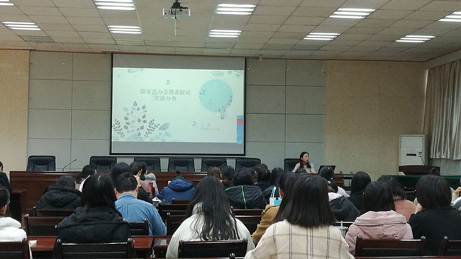 王敏在題為《國家漢辦志愿者面試交流分享》的報告中從心理測試、綜合面試、英語面試等三個方面出發,結合自身的海外教學經驗,講述了漢辦面試的經歷及志愿者精神的內涵。于明嬌在題為《漢辦志愿者面試》的報告中從面試環節、崗前培訓、面試真題及出國建議等四個方面,對國家漢辦志愿者的面試情況進行了具體的講解與分析。