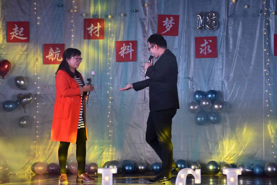 第一篇章:揮灑青春。四位2018級新生們用唯美的歌聲演唱《Lucky》,表達了大一新生踏進大學校園的美好愿望。隨后,材料類1802班演繹的小品《同桌的你》通過幽默詼諧的獨白和搞笑豐富的肢體語言生動展現了大學生對友情的珍惜和感動。歌曲《違背青春》和說唱《目不轉睛》將晚會氣氛推向高潮。接下來由宋二鵬老師和侯陽老師表演的相聲《創業》,一捧一逗之中表達了對我們未來的殷切期望。來自學生助理們表演的《小人舞》,小小的身體,大大的能量,為觀眾帶來了不一樣的精彩。