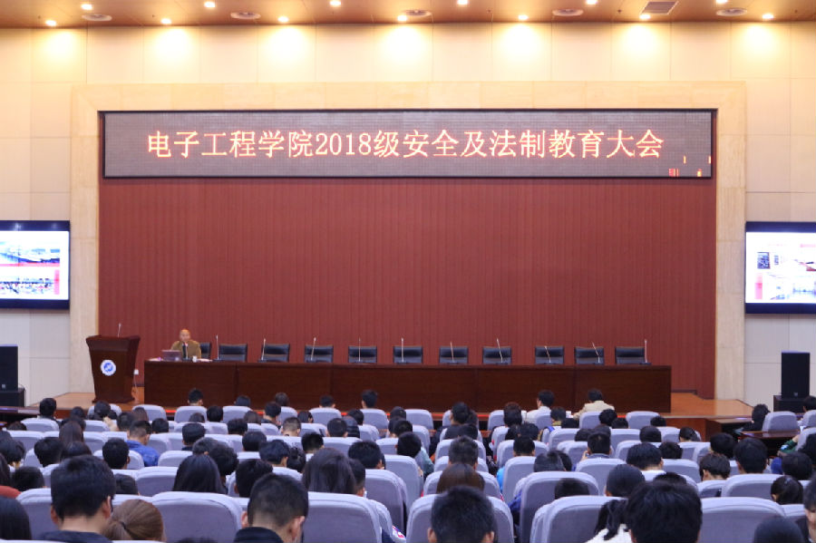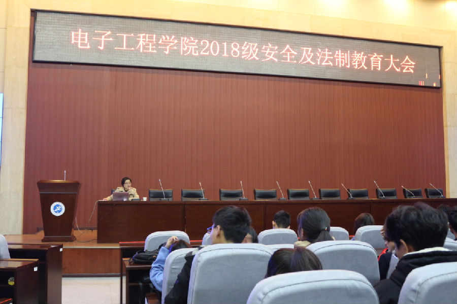 11月1日中午,電子工程學院在弘石報告廳舉辦了2018級安全教育大會暨法制教育講座,會議由院學生管理辦公室主任畢軼慧主持。本次講座邀請到了校保衛處張永華副處長擔任主講嘉賓,院黨委副書記黃建禮出席了本次會議,學院2018級輔導員及2018級全體學生共同參加了本次會議。