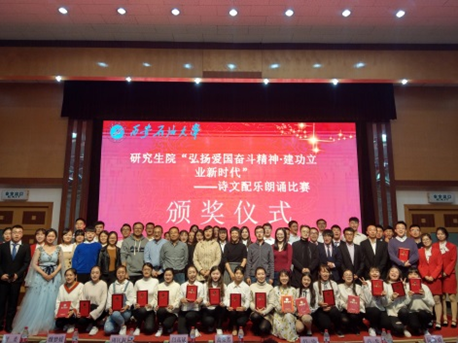 經過激烈角逐,由研究生院黨委領導,院團委、教職工黨支部代表及研究生代表組成的8人評審團,按照選題立意、朗誦內容、作品感染力、個人儀態、現場效果等方面,對參賽作品逐一進行打分。最終石工類、人文類參賽作品《以夢為馬》和人文類參賽作品《春天里的中國》獲得一等獎,思政類參賽作品《新時代新絲路》獲得二等獎,石工類《相信未來》《我愛我的祖國》及機械類《鏗鏘的腳步》獲得三等獎。