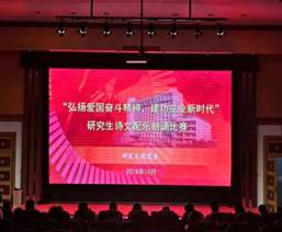 研究生院黨委書記高榮芳對此次朗誦比賽的圓滿成功表示祝賀,對表演者的水平和精神面貌,予以充分的肯定,并勉勵各位研究生要在自身學習生活中,進一步弘揚愛國奮斗精神,胸懷“家國天下”的精神,努力提高自身綜合素質,為新時代中國特色社會主義建設增磚添瓦。研究生院黨委副書記范琦在致辭中希望參賽選手能用詩歌表達我們心中對國家和民族的崇高敬意,用激昂的文字和抑揚頓挫的語言,謳歌改革開放40周年取得偉大成就,展現我們建設社會主義新時代的追求。