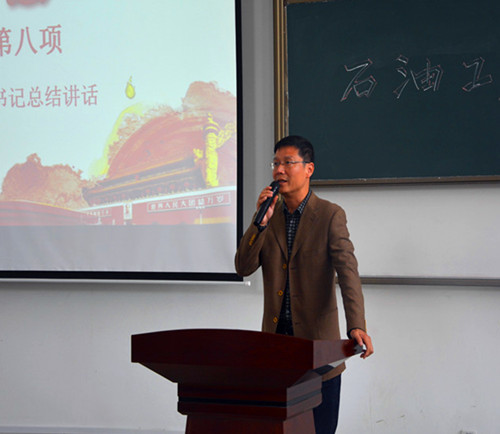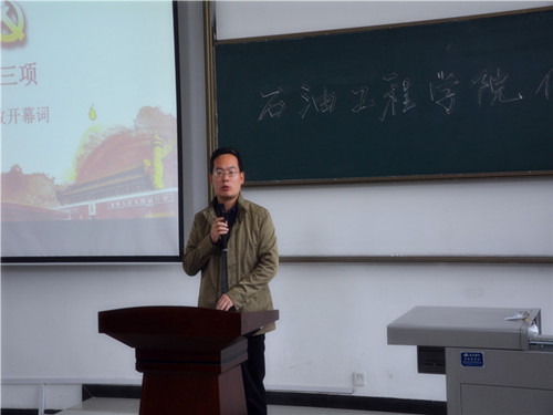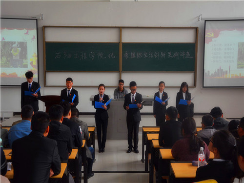 為深入學習貫徹習近平新時代中國特色社會主義思想和黨的十九大精神,落實全國高校思想政治工作會議精神,進一步推進“兩學一做”學習教育常態化制度化,響應學校要求,推動我院學生黨支部建設,提高學生黨支部組織生活的質量和效果,增強學生黨支部的創造力、凝聚力和戰斗力,石油工程學院黨委于2018年10月24日中午12:30在鄠邑校區石工地科樓115教室舉行了學生黨支部優秀組織生活創新案例評選活動。學院黨委書記馬勇、黨委副書記張建高、黨委組織委員孫會珠、化學化工學院黨委兼職組織員屈敏佳、經濟管理學院黨委兼職組織員武威受邀參加并擔任評委,學院全體輔導員及130余名學生黨員也參加了活動。