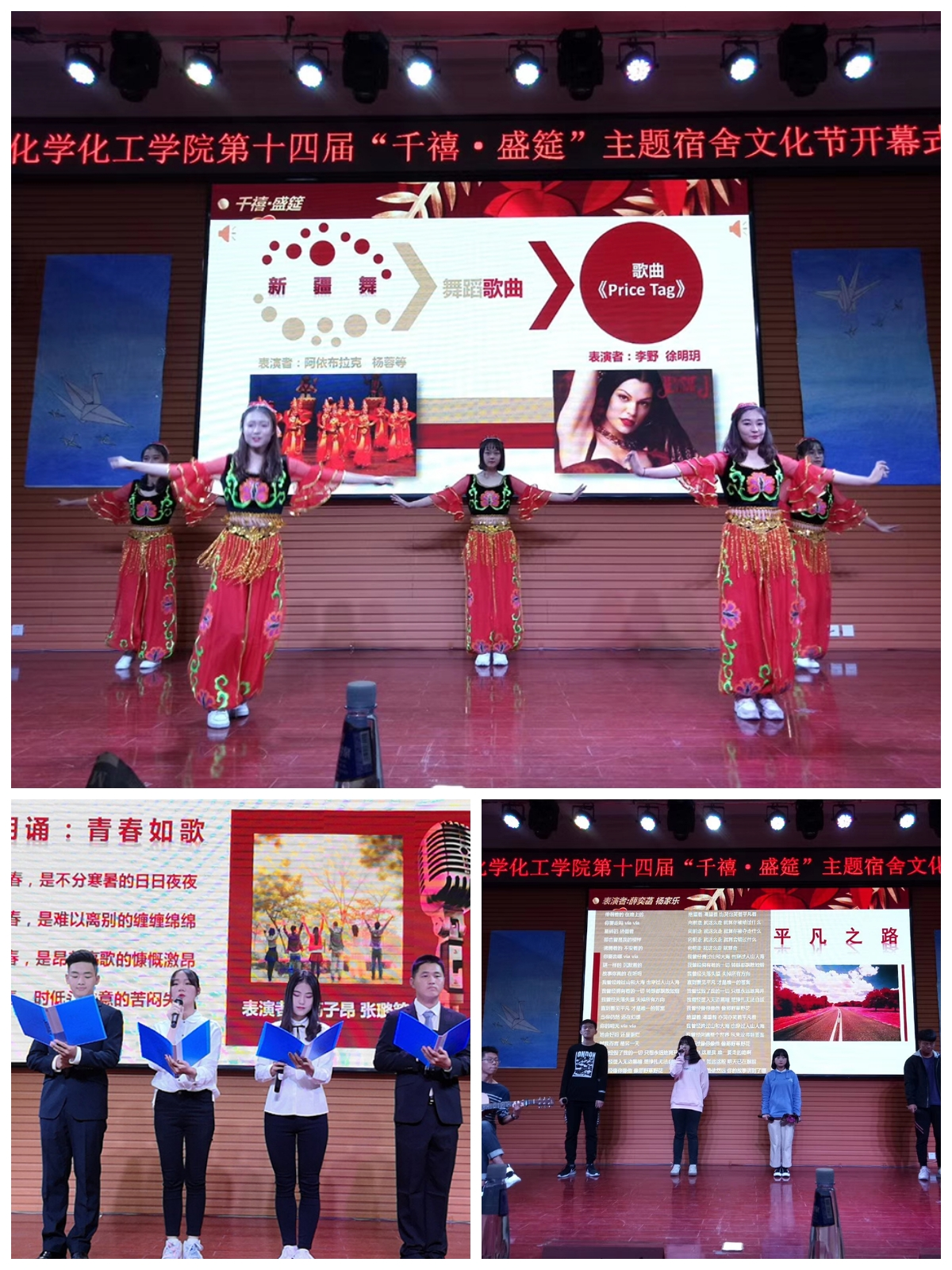 開幕式在校歌聲中拉開了帷幕。《平凡之路》表達了千禧年出生的新生們的心聲。《智取威虎山》展示了新生說、學、逗、唱的多才多藝。新疆少數民族學生參與的歌舞,富有新疆特色,贏得了臺下同學的陣陣掌聲。詩朗誦《青春如歌》,則是大學新生們對建設積極向上、陽光健康的校園文化的鏗鏘回答。整個節目精彩紛呈,展現了學院學生昂揚向上的精神面貌。