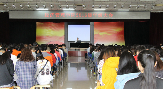 9月28日下午,經濟管理學院2016級年級大會在鄠邑校區騰輝大學生活動中心召開。本次會議由輔導員武威老師主持,2015級推免生代表與2016級600余名學生參加。