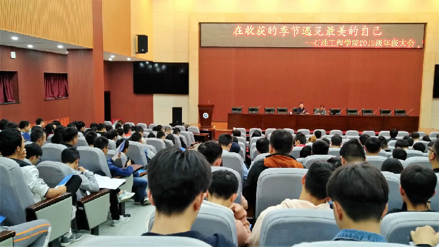9月25日晚7點,石油工程學院2015級在新校區弘石報告廳召開了以“在收獲的季節遇見最美的自己”為主題的年級大會。參加本次會議的有石油工程學院學生管理辦公室主任孫會珠老師,2015級輔導員朱戰威老師以及2015級全體同學。