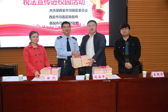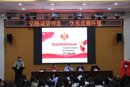 區稅務局總經濟師徐凱介紹由西安市團委、稅務局、財政局聯合發起的稅收宣傳進校園的活動概括,并宣傳從早抓起,在學生中倡導懂法、知法、守法、學法,鼓勵學生爭做稅收宣傳員。