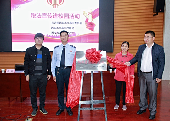 9月18日下午,經濟管理學院書香校園系列活動之稅收普法基地揭牌儀式在經管人文樓118舉行。鄠邑區團委副書記陳睿,區稅務局總經濟師徐凱,區財政局、區稅務局青春夢之隊成員代表以及經濟管理學院黨委副書記趙海濤,校團委校園文化部部長姜國平,經濟管理學院2016級會計系全體學生參加了本次活動。