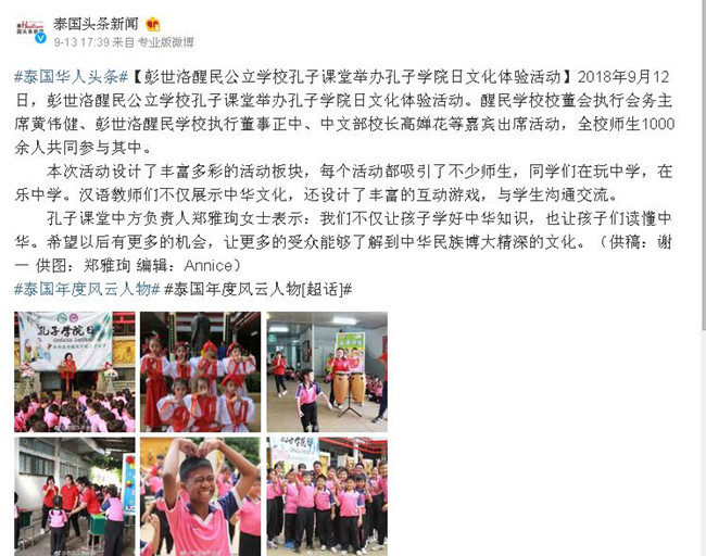 近日,人文學院漢語國際教育專業17級研究生在泰國醒民學校孔子課堂舉辦了孔子學院日活動。這是由并國家漢辦、孔子學院發起,世界各地孔院同時舉辦,為紀念孔子學院建設發展的重要慶祝活動,其目的是宣揚中華文化,推廣漢語教育。此次活動被泰國華人頭條網報道,受到了當地校領導和學生們的一致認可和高度評價。