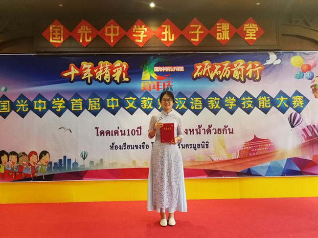 2018年9月10正值中國的教師節,泰國國光中學孔子課堂舉辦了特殊的慶祝活動“國光中學首屆中文教師漢語教學技能大賽”,希望在這個特殊的日子里讓老師能夠以賽促教,以賽促學,能夠更好的發展對外漢語教學。我校漢語國際教育專業17級在讀碩士、漢語國際教師志愿者黨杏丹同學在此次活動中榮獲三等獎。