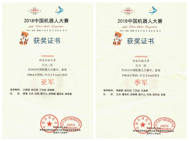 我校代表隊在FIRA小型組半自主5vs5項目賽中,經過常規賽、加時賽、點球大戰,成功小組出線。歷經一天的緊張調試和兩天的激烈角逐,我校代表隊最終在FIRA小型組半自主11vs11項目和5vs5項目決賽中分別獲得亞軍和季軍。我校學子再次在國內重要的賽場上發揮了高超的科學競技水平,展現了良好的精神風貌。