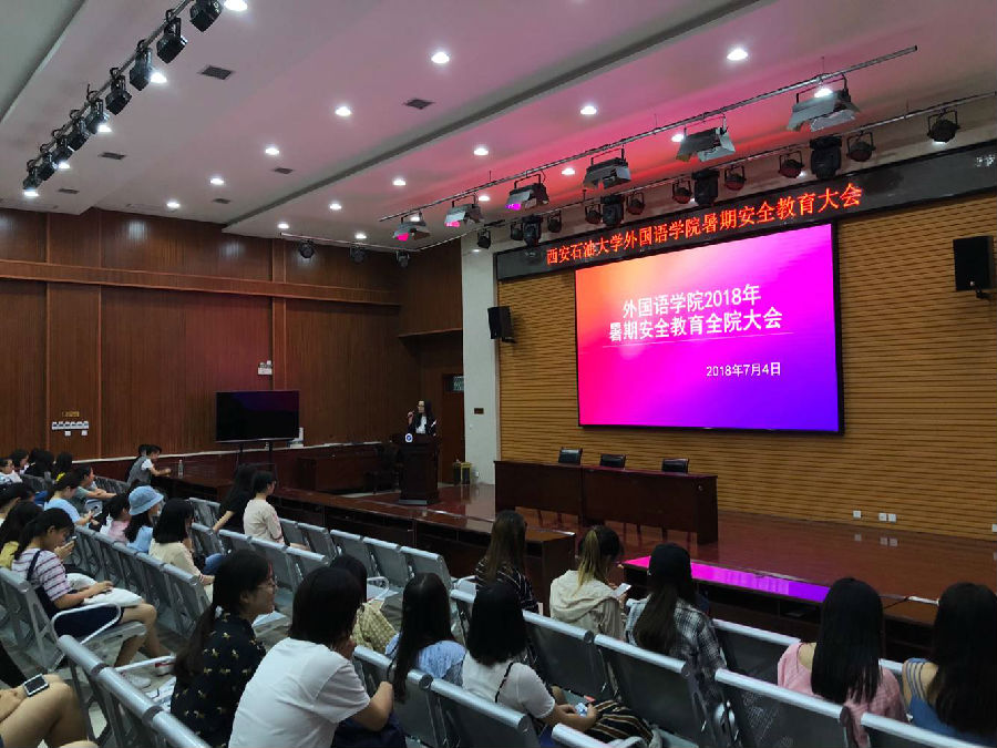 2018年7月4日晚19:00,我院于三號院系樓就業指導中心舉行2018年暑期安全教育大會,本次大會主講人為外國語學院2016級輔導員李洋甜老師,我院全體學生按時到場。