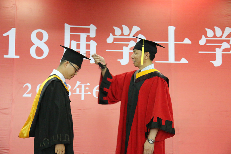 2018屆畢業生代表孫孔明同學代表學院全體畢業生,衷心感謝母校給予他們的精心培養,表示難以忘記四年來老師們的諄諄教誨與同學們的深厚情誼。他代表全體畢業生承諾在未來前進的道路上,他們將秉承對母校的熱愛與感激,肩負起新時代大學生的使命,彰顯西石大畢業生的風采。隨后在莊重的音樂聲中,周德勝院長為每位畢業生頒發學位證書、一一撥正流蘇并合影留念。